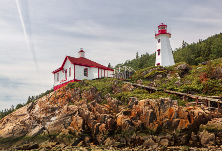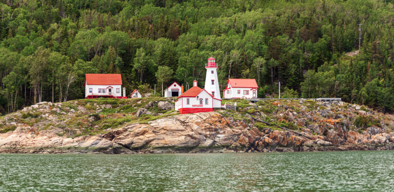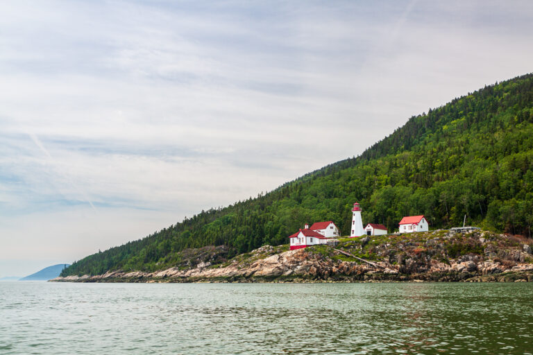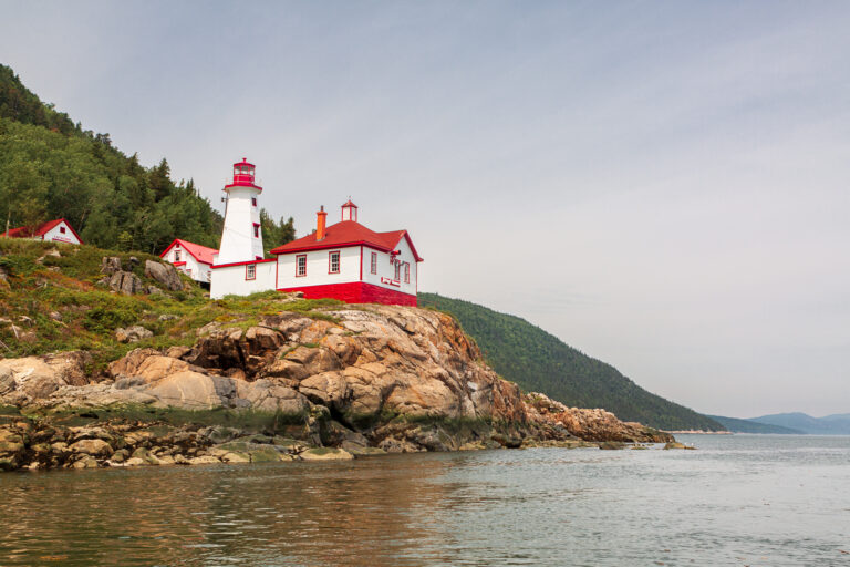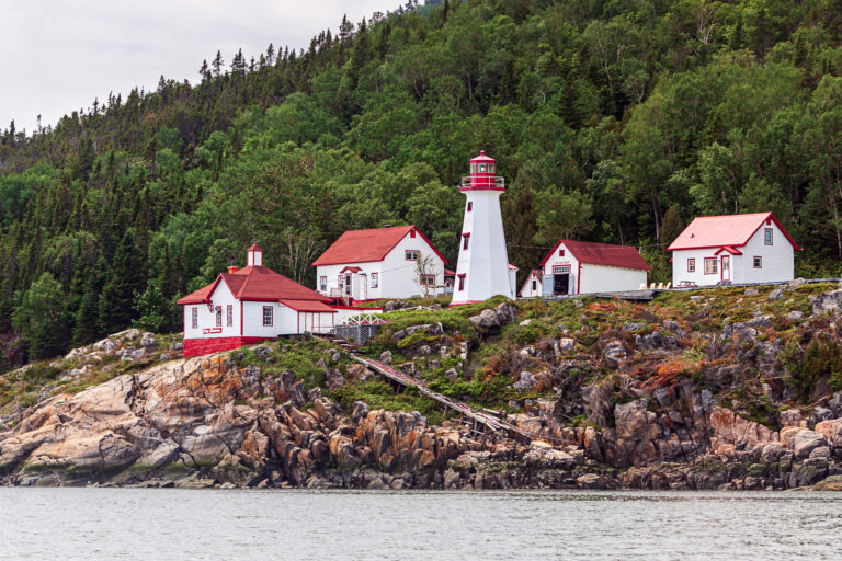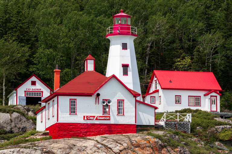 Le phare de Cap-au-Saumon, situé à Saint-Siméon dans la région de Charlevoix, est une tour octogonale en béton armé de 14 mètres de hauteur construite en 1955 sur un promontoire rocheux, remplaçant une structure de 1894. Il est reconnu pour sa valeur patrimoniale en tant qu’aide à la navigation sur le fleuve Saint-Laurent.